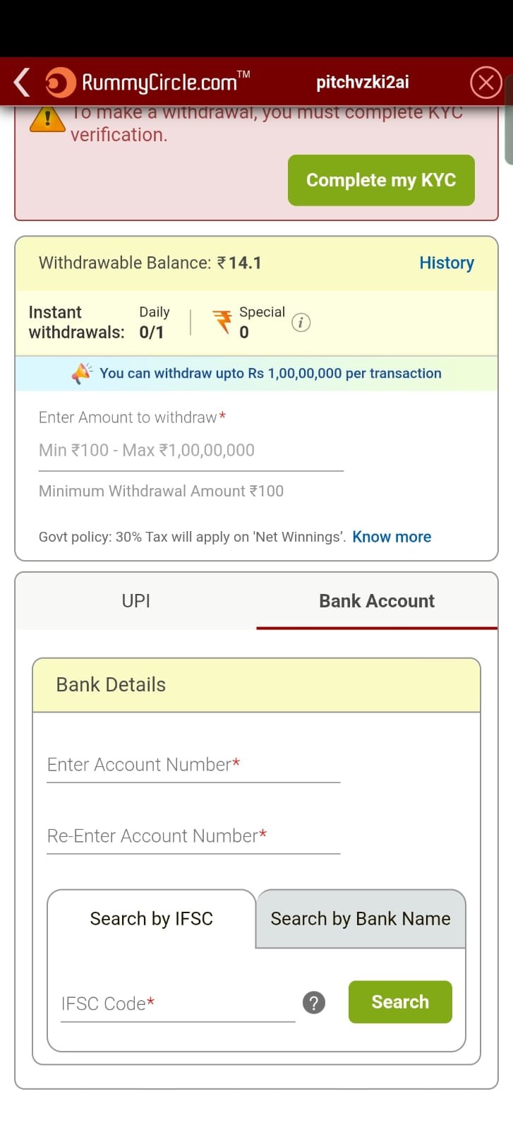 जब आप पहली बार निकासी का अनुरोध करते हैं, तो आपको अपना बैंक खाता नंबर और IFSC कोड प्रदान करना होगा। ये विवरण आपके अगले निकासी अनुरोधों में स्वचालित रूप से भर दिए जाएँगे। कृपया सुनिश्चित करें कि ये विवरण सही हैं। यदि आप गलत विवरण प्रदान करते हैं, तो RummyCircle ऐप ज़िम्मेदार नहीं होगा।