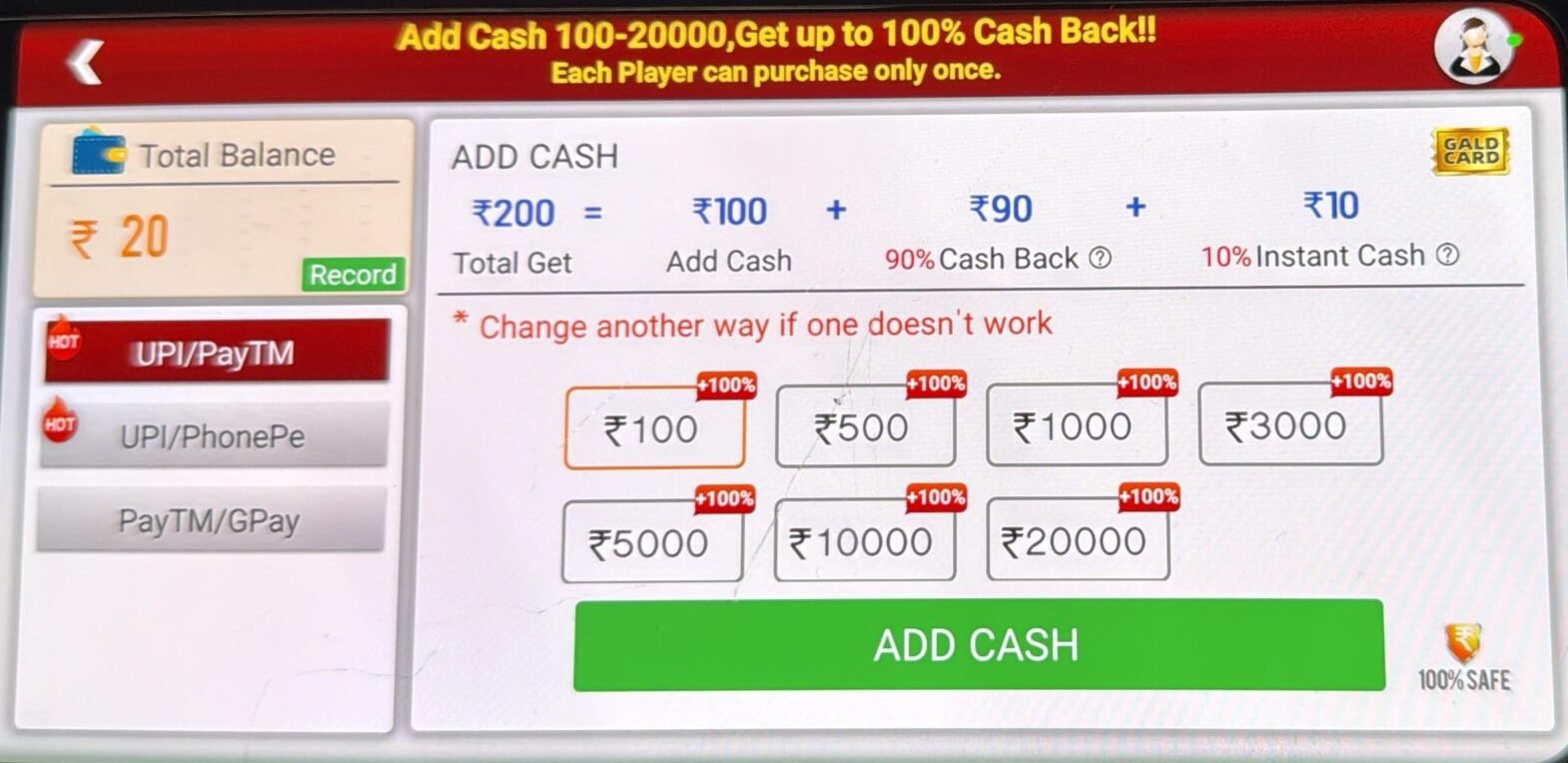 दोस्तो आपको Teen Patti Refer Earn Real Cash App में Deposit Amount करने के लिए कोईभी KYC Form भरने की जरूरत नहीं है और दोस्तो आपको Add Cash Amount पर 100% Cash Back Bonus भी मिलेगा सबसे मजेदार बात है।आपको Game के अंदर Store Add Cash का Option मिलगा उस पर Click करे और आपको जीतना Amount Add करना है Select करे। Minimum 50₹ ओर Meximum 20000₹ Rupees Add Cash Amount Limit है इस हिसाबसे आप अपना Amount Select करे। निचे लिखा होगा Add Cash उसपर Click करे आपके सामने Payment Method Select करने का Option आयेगा Google Pay, Paytm, Phone Pay और Other UPI आपको जिस तरह की Method Select करना है करे Payment करदे।