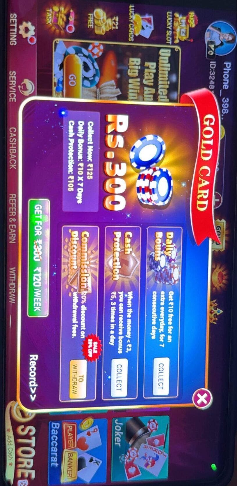 दोस्तो Teen Patti Refer Earn App में आपको New Gold Card Option भी मिलता है।आपको यह सुविधा Week के लिए लाभ उठा ने के लिए 300₹ में Buy कर सकते हो ओर अगर दोस्तो आप हमारी Teen Patti Refer Earn App Link से Download करते हो तो आपको सिर्फ 120₹ में Gold Card Buy कर सकते हो। Gold Card Buy करते ही आपके लिए Teenpatti Refer Earn Application में बहुत सारे Free Cash मिलने के Option Open होजाएगे ओर आपको कही सारे Benifit भी मिलेगे। आपके Game Wallet में अगर 3₹ Rupees से कम Amount होगा तो आपको एक दिनमे तीन बार 5₹ Rupees मिलेगे ओर आपको एक Week तक Daily 10 ₹Bonus मिलेगा। इस के अलावा आपको Withdraw करने में जो Tax कटेगा उसमे 20%प्रतिसत Discount मिलेगा मतलब की आपको Withdrawal Tex में 20 प्रतिसत सूट मिलेगी।