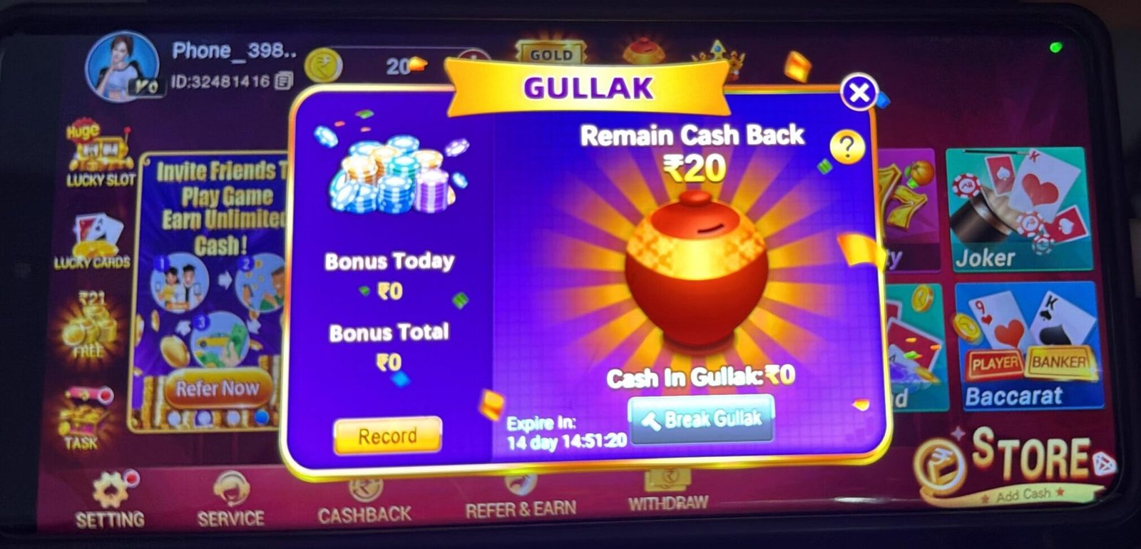 आपको Teen patti Refer Earn Apk में Gullak Option भी मिलता है जिसमे आप जभी कोई भी Games खेलते हो और Cash Loss होता है तो उसका 2% Commission Gullak में जमा होता है और आप उसे 15 Days में कभी Break करके Collest कर सकते हो। याद रखिए अगर 15 Days में आपने Gullak Break नही किया तो अपका Gullak 15 Days के बाद आपका Bonus Commission Validity नही रहेगा।