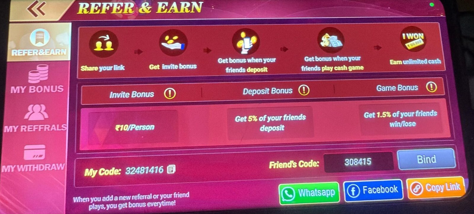 दोस्तो आपको 3Patti Refer Earn Game के अंदर नीचे की तरफ बिचमे Refer & Earn लिखा होगा उस पर Click करके आपBest Teen Patti Refer Earn को Refer कर सकते हो। आपको निचे Refer का Option मिल जाएगा उस पर Click करे। अब आपको बहुत सारे Option मिल जाएंगे उस में Left Side पर Whatsapp Facebook और Copy Link का Option मिलेगा। वाहसे Copy Link पर Click करे और अपने दोस्तो को WhatsApp, Facebook, Telegram, YouTube, Instgram ओर Other Social Media Apps के जरिए अपने रिस्तेदारो को और Friends को Share करे। अब आपकी Referral Link से कोई भी Teen Patti Refer Earn Application Download करके New Mobile Number से Regester करता है तो वह आपका Referral बन जाता है।